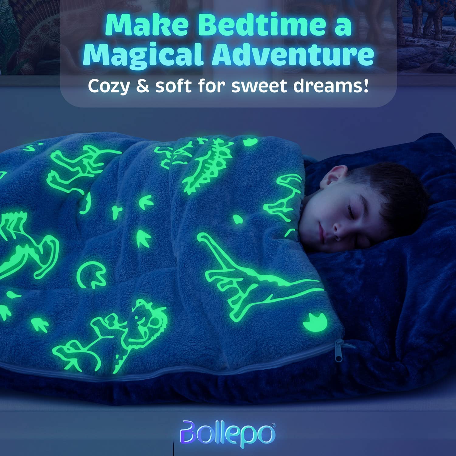 • Unique Glow-In-The-Dark Design - Make it a fun experience with our kids sleeping bags for camping. It features 8 expertly-designed dinosaurs that glow in the dark, making the night less scary.
