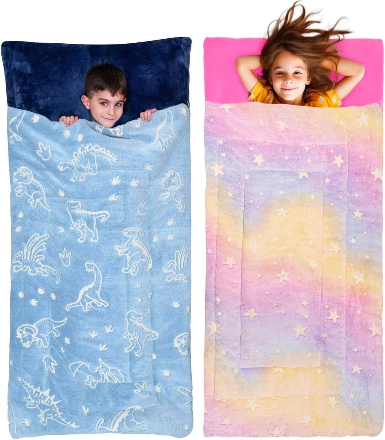 ๐ŸŒŸย Double the Fun: Dinosaur and rainbow star sleeping bags.